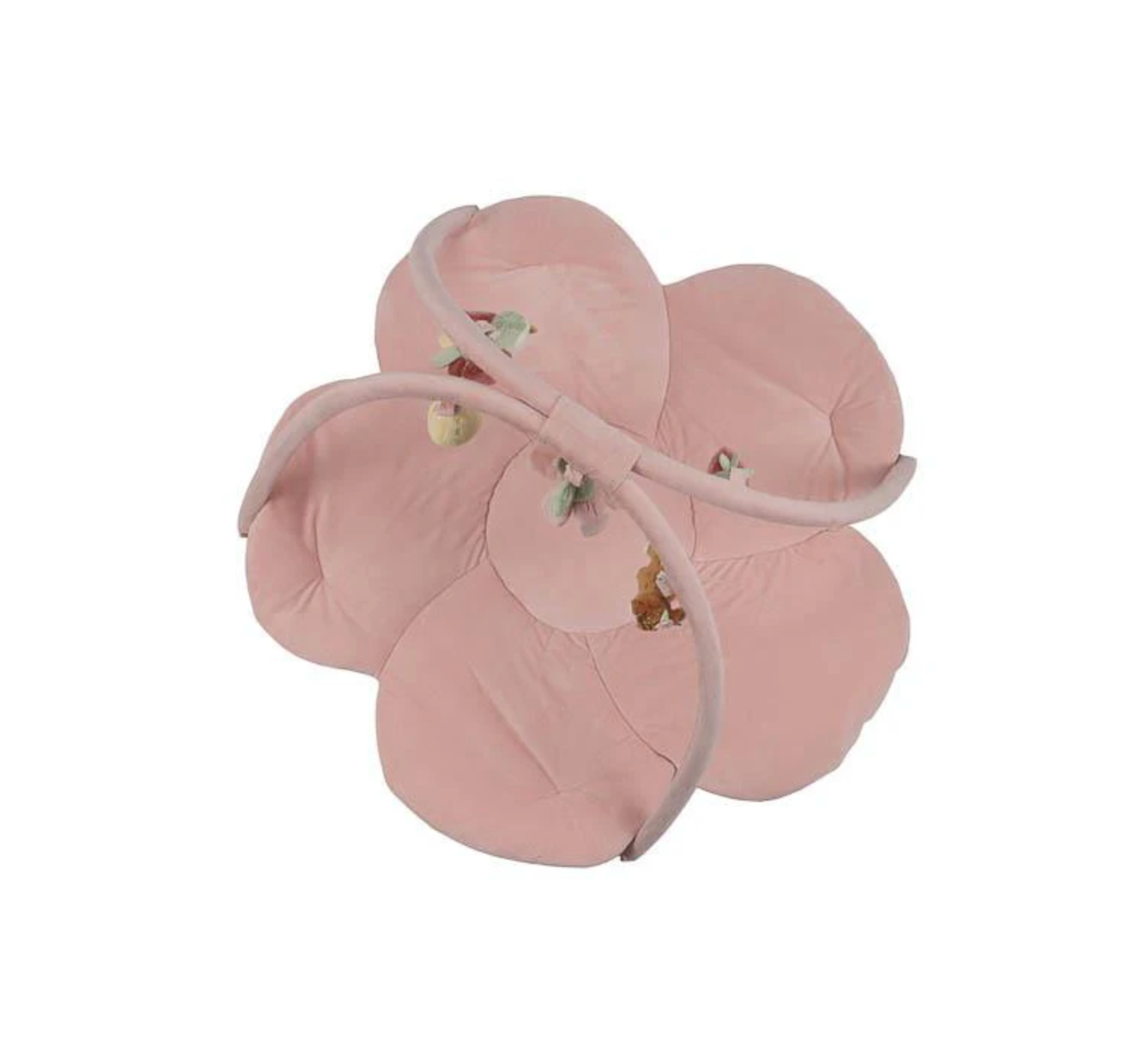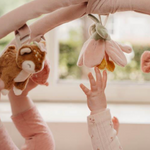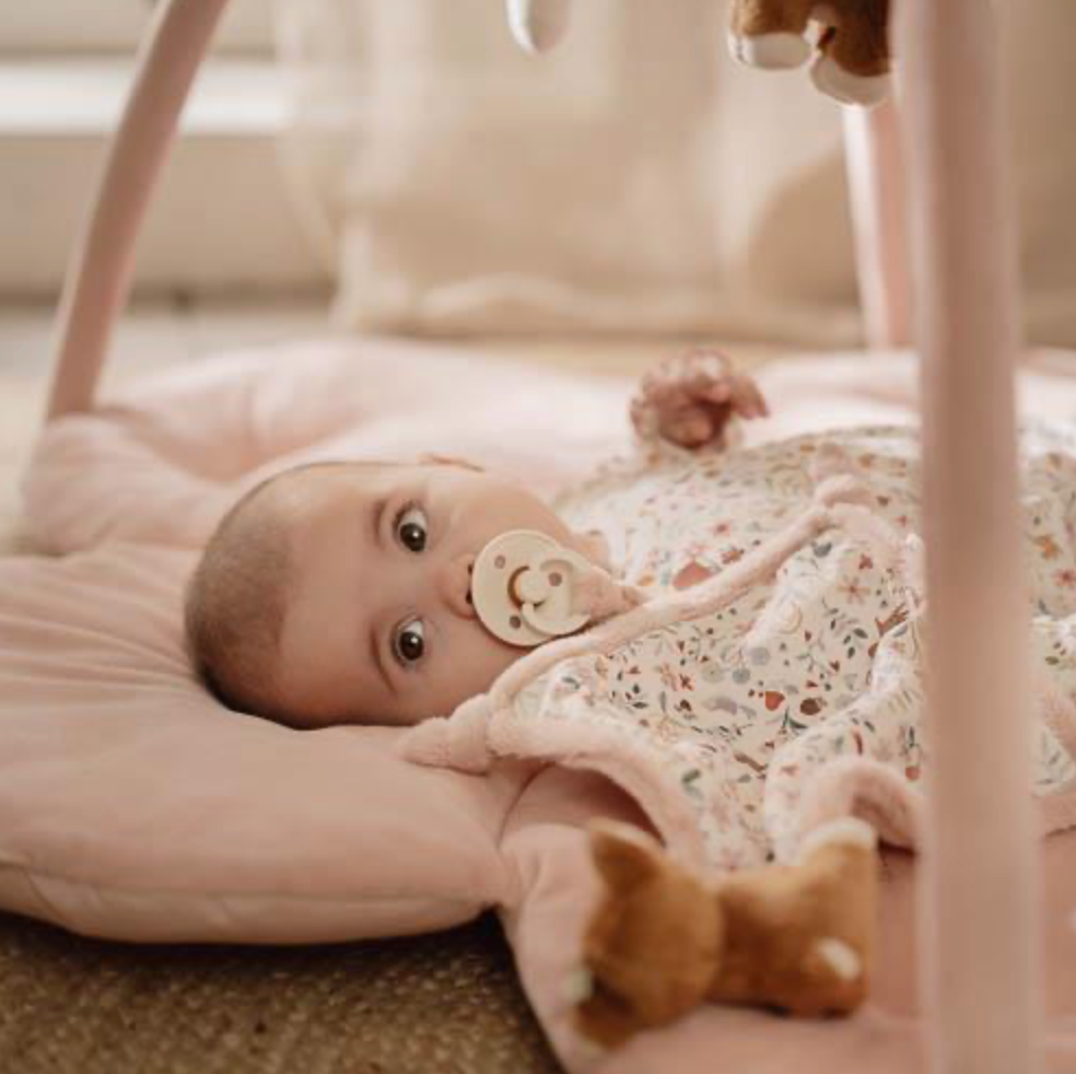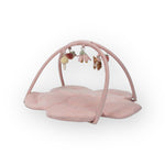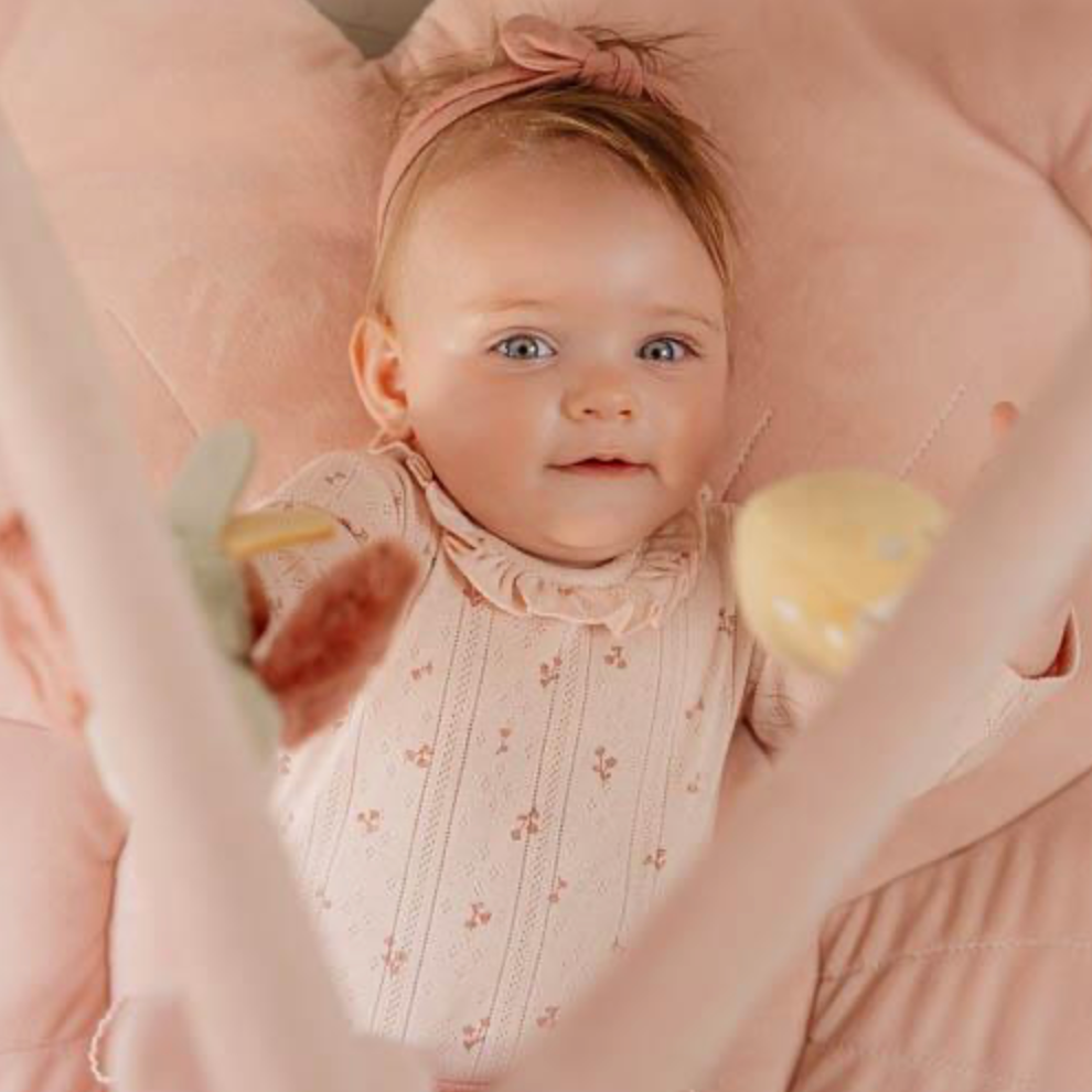 Le tapis rose a deux grands arcs en velours côtelé d'où pendent cinq peluches différentes de la collection Fairy Garden. Le petit faon, l'oiseau, le champignon, la fleur et la fraise aident votre mini à développer ses compétences sensorielles et stimulent la coordination main-œil.