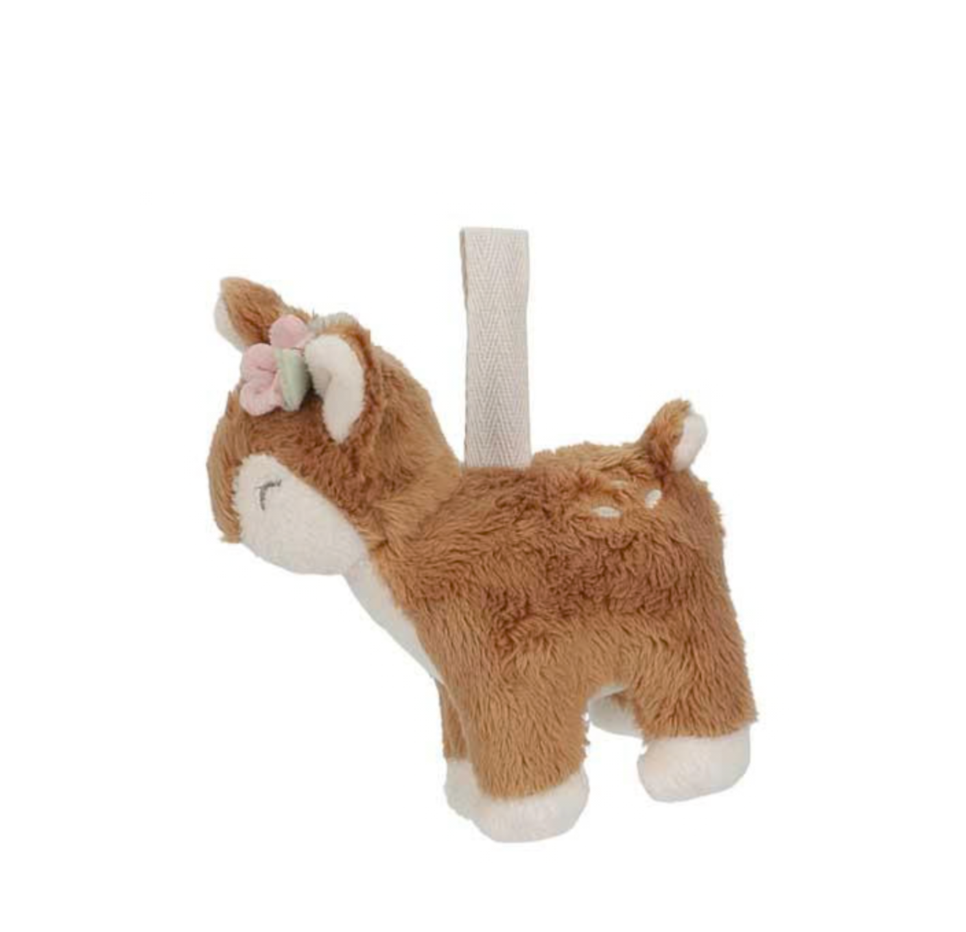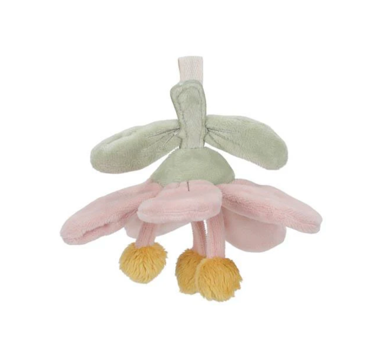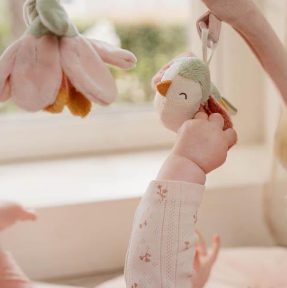 Le tapis rose a deux grands arcs en velours côtelé d'où pendent cinq peluches différentes de la collection Fairy Garden. Le petit faon, l'oiseau, le champignon, la fleur et la fraise aident votre mini à développer ses compétences sensorielles et stimulent la coordination main-œil.