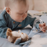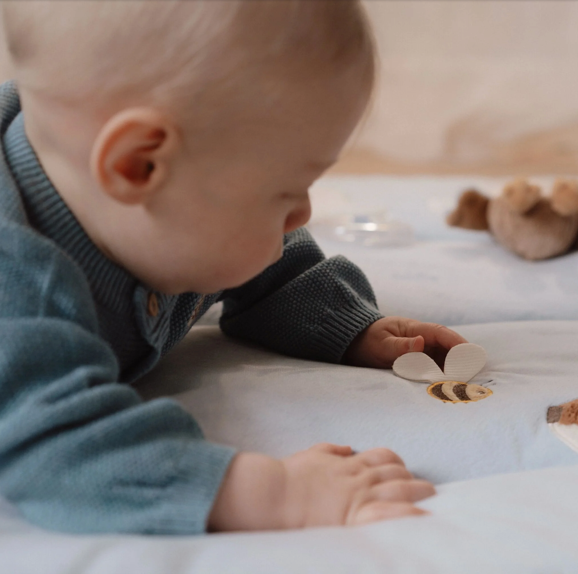 Il y a tant à découvrir et à voir ! Votre mini part à l'aventure pour trouver la feuille crépitante et les nuages doux, rencontrer le gentil petit renard doux et jouer avec le hibou et le petit coléoptère. Il y a aussi un petit miroir pour l'auto-découverte et un anneau transparent avec trois perles qui cliquettent lorsqu'elles bougent.