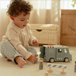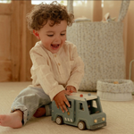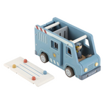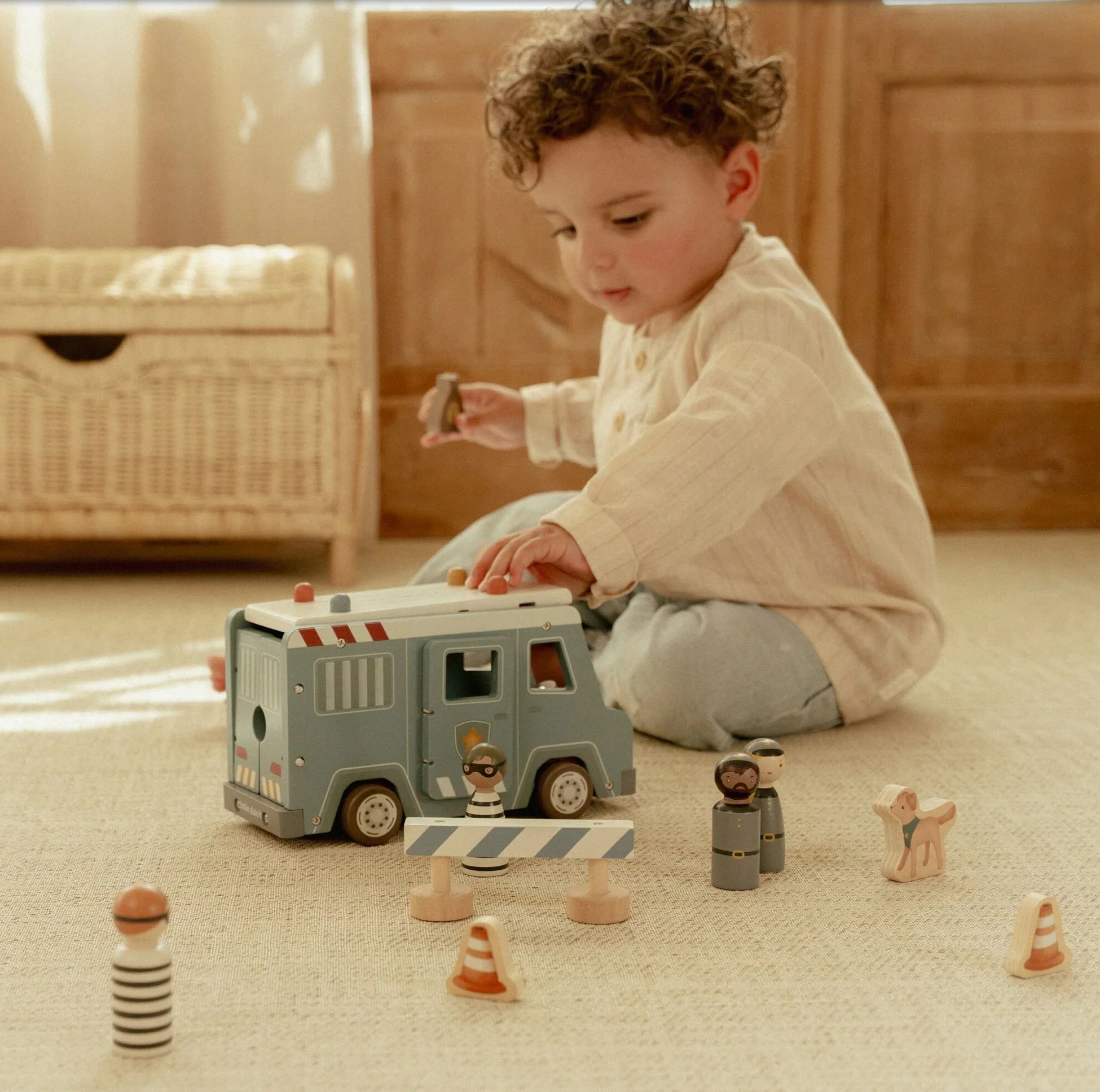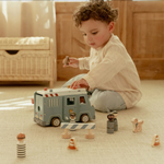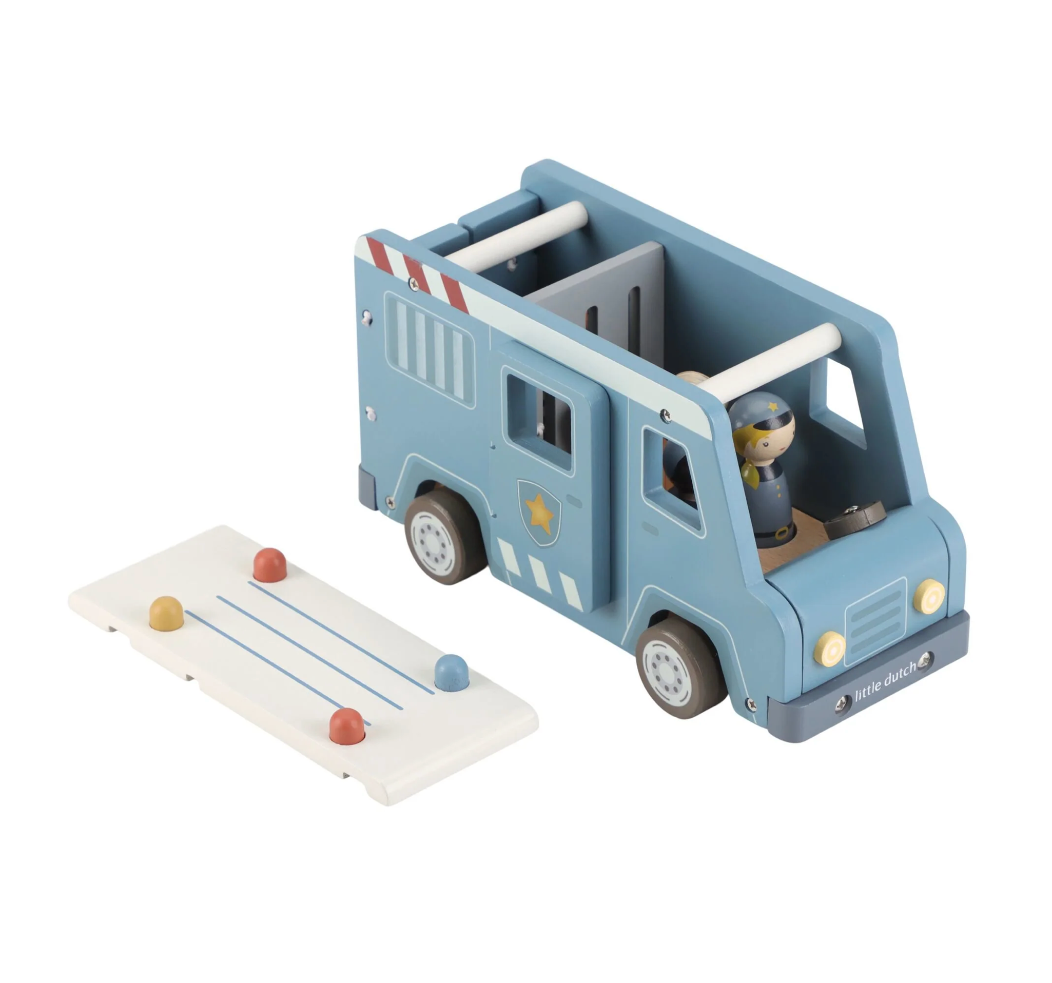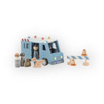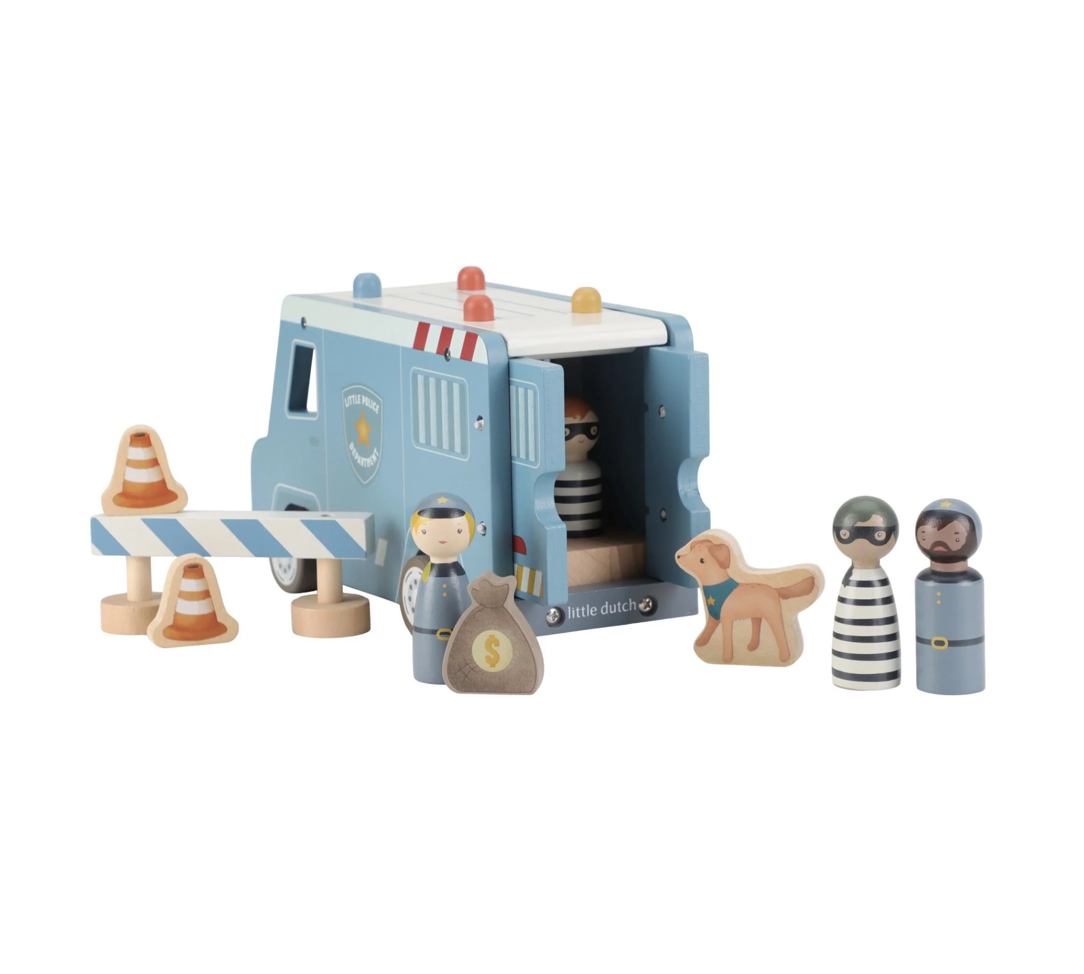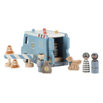 Bandits derrière les barreaux ! Ce fourgon de police en bois contient quatre figurines (deux policiers et deux bandits), un chien policier, un sac d'argent, des cônes et une barrière. Le fourgon a une cellule avec une porte rabattable, de sorte que les bandits peuvent être transportés en toute sécurité. Rejouez des aventures policières passionnantes et gardez la ville en sécurité !