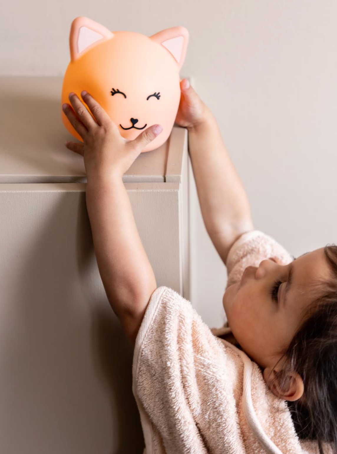 Un ami joyeux et plein de douceur qui se fait un plaisir d’accompagner votre mini dans ses rêves une fois la lumière éteinte. Cette veilleuse est rechargeable et fabriquée en silicone doux. Il suffit d’appuyer sur sa tête pour régler l’intensité de la lumière.